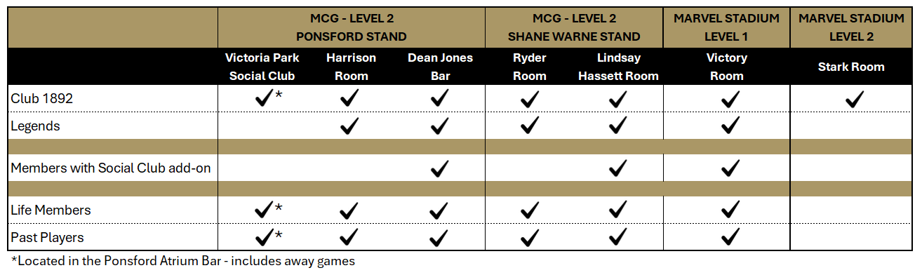 Members can access a range of rooms at the MCG and Marvel Stadium for home games. Access to each room will be granted upon presentation of an eligible member card, mobile membership or medallion (pictured below).